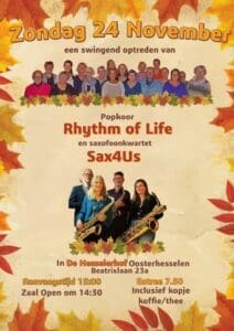 Rhythm of life is een gezellig popkoor. Elke donderdagavond repeteren we, van half acht tot half tien, onder leiding van onze enthousiaste dirigente Mariet Piersma. We zingen driestemmig met sopranen, hoge alten en lage alten. We hebben helaas geen bassen meer. We zingen zowel nieuwe popliedjes als de wat oudere popsongs. Wil je een keer komen kijken of meezingen dat kan altijd. Aanmelden bij de voorzitter is handig, dan weet je zeker dat er een repetitie is. We hebben onze repetitie in ’t Ieshokkie in Zwiggelte, waar het na de repetitie ook heerlijk nazitten en bijkletsen is.